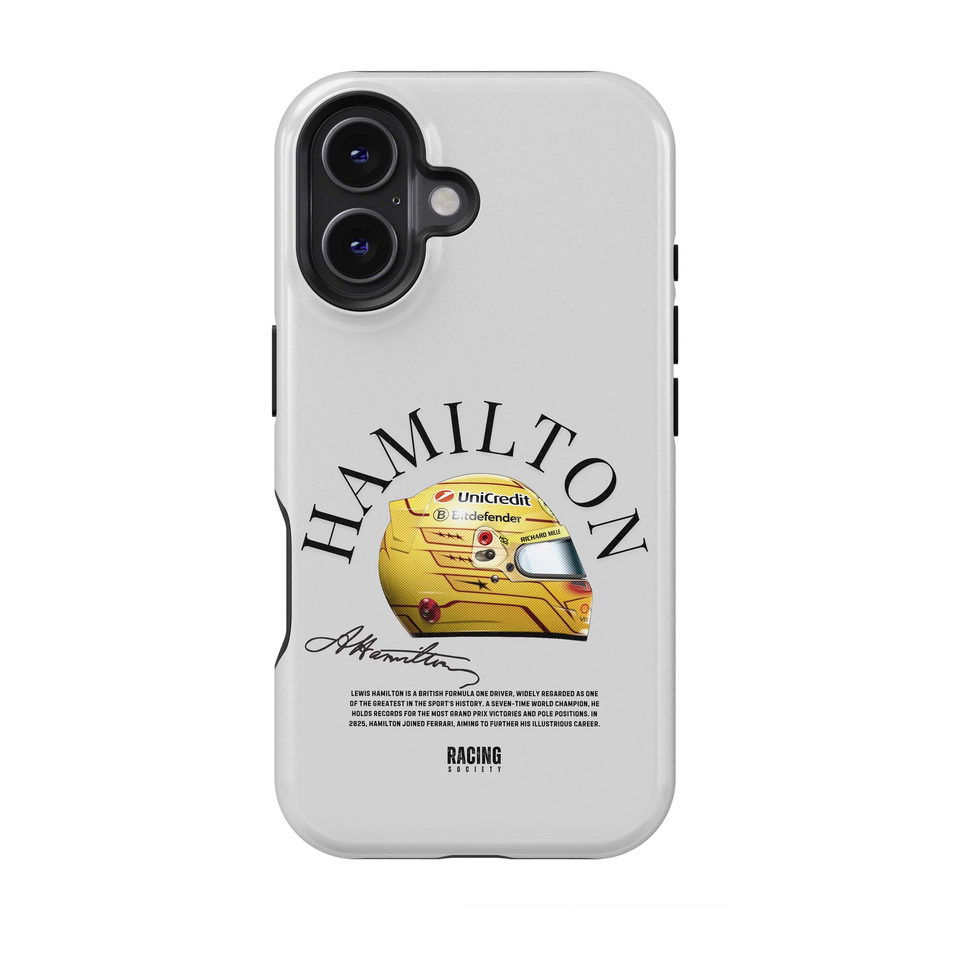 The Hamilton Phone Case is built like the driver himself: focused, composed, and tough under pressure. With a shock-absorbing inner rubber layer and a scratch-resistant hard outer shell, it’s made to protect your phone with the same precision Lewis brings to every lap. Sleek, strong, and ready for anything.